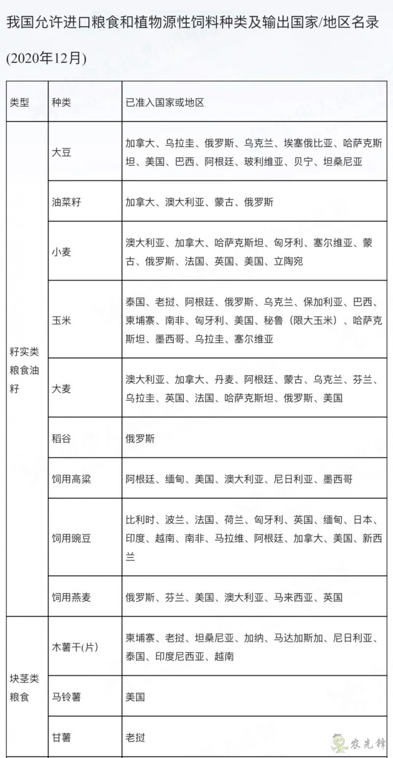 2020年12月30日,海關(guān)總署更新了《我國允許進(jìn)口糧食和植物源性飼料種類及輸出國家/地區(qū)名錄》,詳見以下圖片。